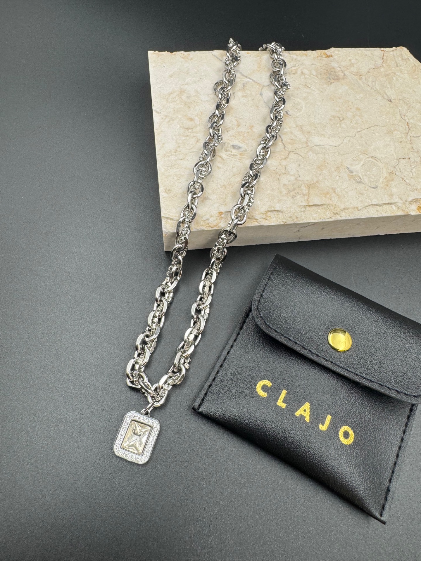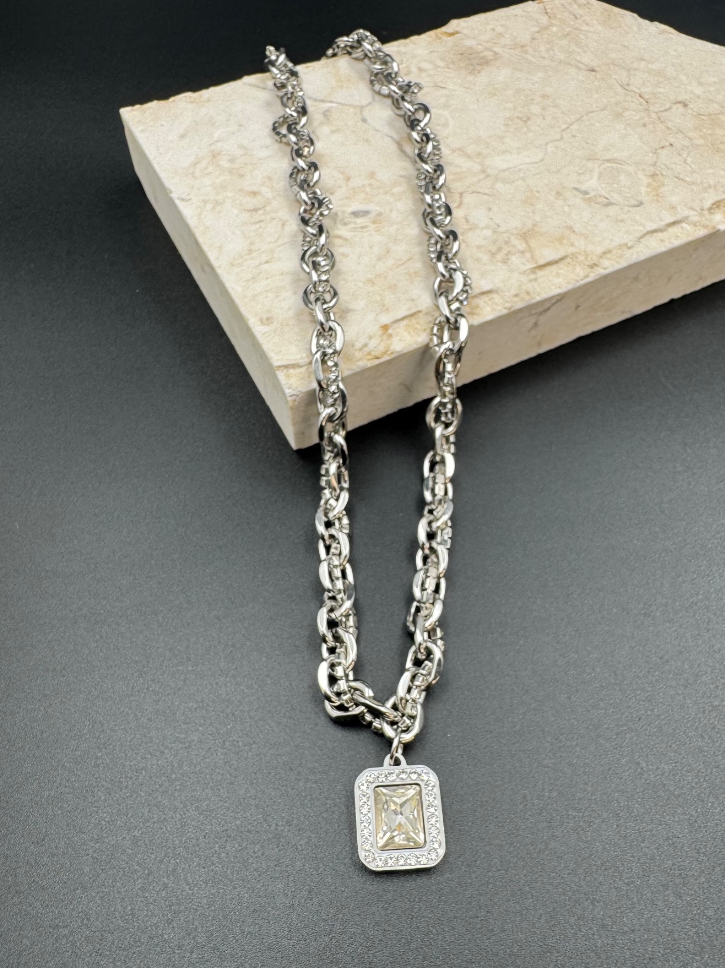獨特的雙鏈設計,一粗一細的鏈條相互纏繞,帶來層次感的同時,確保佩戴舒適無負擔。正如強者不需張揚,光芒內斂卻無法忽視。水鑽鑲嵌的吊牌,折射出的不僅是光線,更是一種堅定的態度——無論身處何地,皆能自信閃耀。